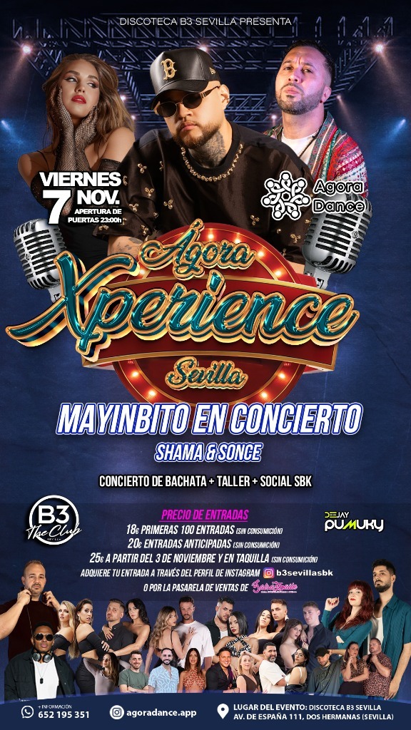 Consigue tu entrada a través de Instagram Agora Dance Official o desde la pasarela de ventas de https://lasalsadelbaile.com/Agoraexperiencesevilla-Mayimbito.