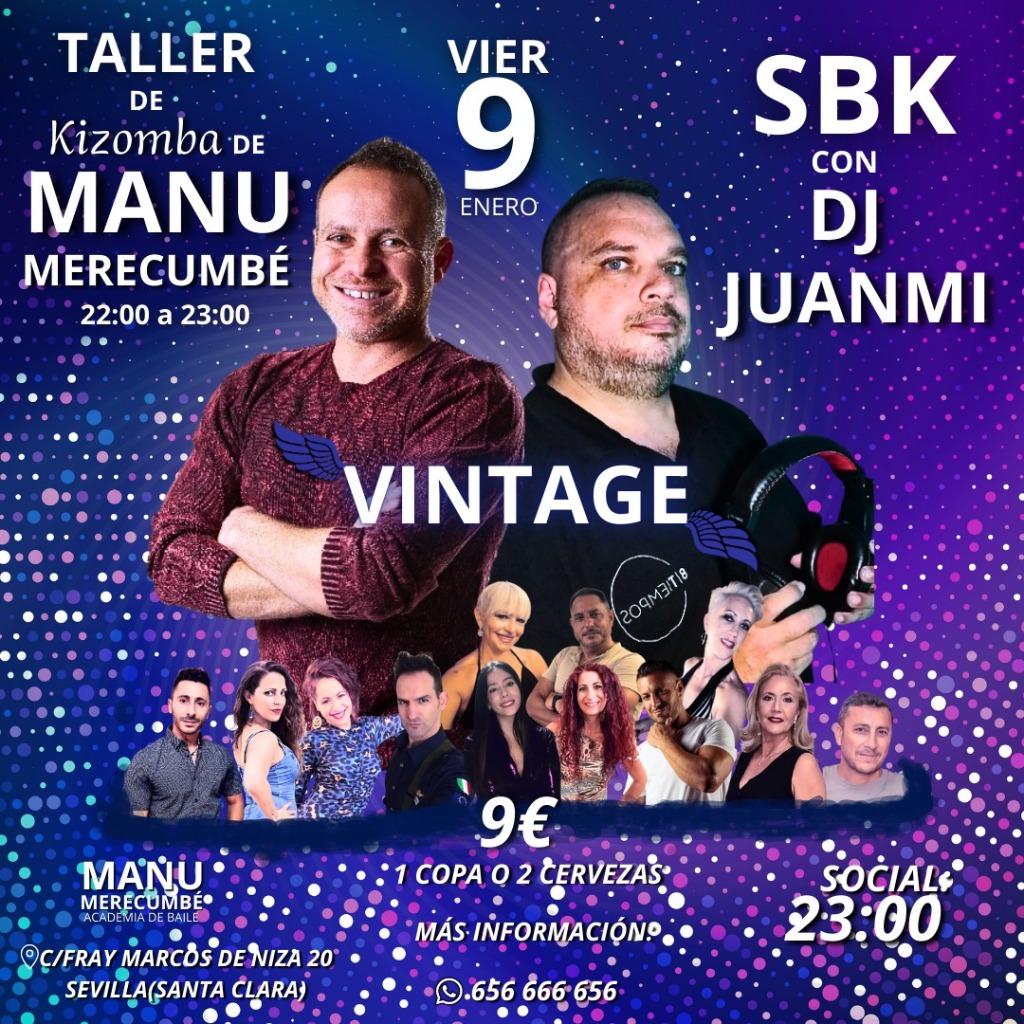 🎉 Come and enjoy a magical night at the Kizomba WORKSHOP by MANU MERECUMBÉ at VINTAGE! 💃 This event is the perfect place to immerse yourself in the contagious rhythm of Salsa, Bachata, and Kizomba. With a vibrant and welcoming atmosphere, you will feel at home as you let yourself be carried away by the music and the energy on the dance floor. 🌟