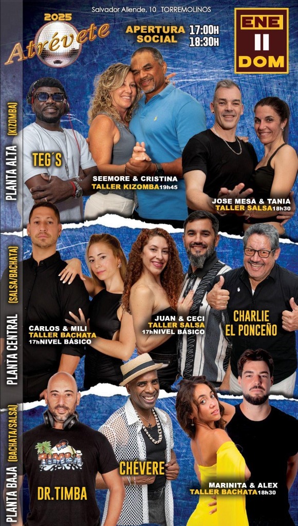 🎉 Get ready for an unforgettable experience at Atrévete en Torremolinos! 💃 This vibrant event will take place in the heart of Salvador Allende, where the energy of salsa, bachata, and kizomba will envelop you in a festive atmosphere. 🌟 With a touch of passion and rhythm, it’s the perfect moment to let yourself be carried away by the music and dance!