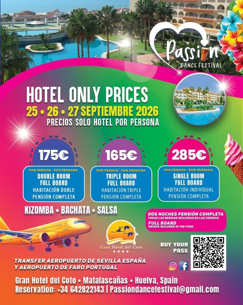 From September 25th to 27th, 2026, the amazing Passion Dance Festival arrives at the Gran Hotel del Coto in Matalascañas (Huelva, Spain) bringing together dancers from all over the world for a weekend full of energy, learning and magical moments.
