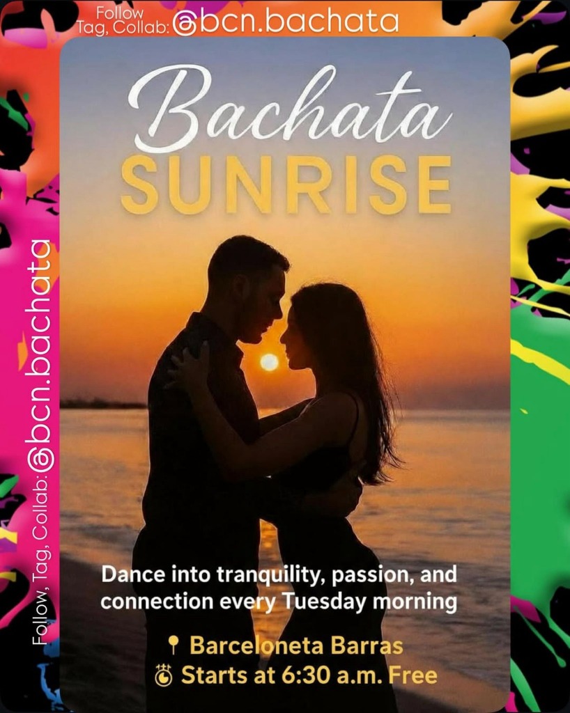 🎉 Welcome to Bachata Sunrise! 🌅 This dance event will transport you to a world full of rhythm and passion in the vibrant atmosphere of Barceloneta Barras. Here, the energy of bachata blends with the sea and the breeze, creating an unforgettable experience that will make your heart beat to the rhythm of the music. 💖
