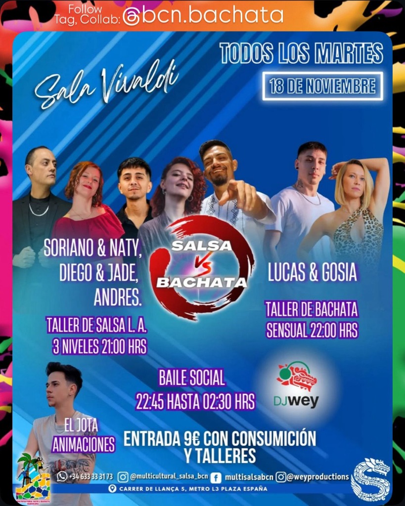 🎉 Get ready for an explosive night at Salsa vs Bachata! 💃 The Sala Vivaldi will be filled with rhythm and energy, where the best salsa and bachata melodies will make you vibrate until dawn. 🌟 Don’t miss this chance to immerse yourself in a festive atmosphere full of passion for dance.