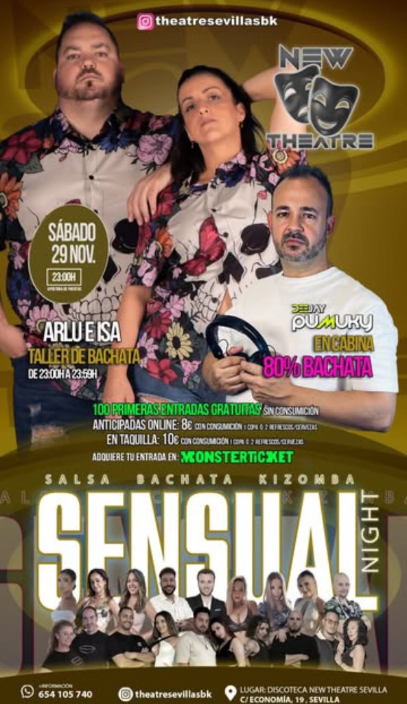 🎉 Welcome to SENSUAL NIGHT! 🌟 Get ready for a night full of Latin rhythms that will ignite your senses. At the New Theatre Sevilla, the vibrant and welcoming atmosphere awaits you to dive into the world of salsa, bachata, and kizomba. 💃