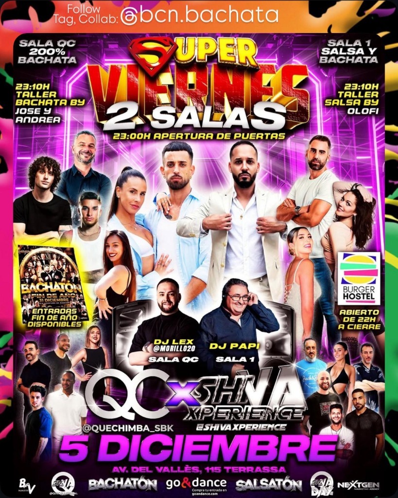 🎉 Get ready for an unforgettable night at the SUPER VIERNES 2 SALAS! 💃 In the vibrant Sala QC, the energy of salsa and bachata will take over the atmosphere, creating a space where every step feels like a celebration. 🌟 Come enjoy a unique party, where music and dance intertwine, and where the passion for rhythm will make you move non-stop.